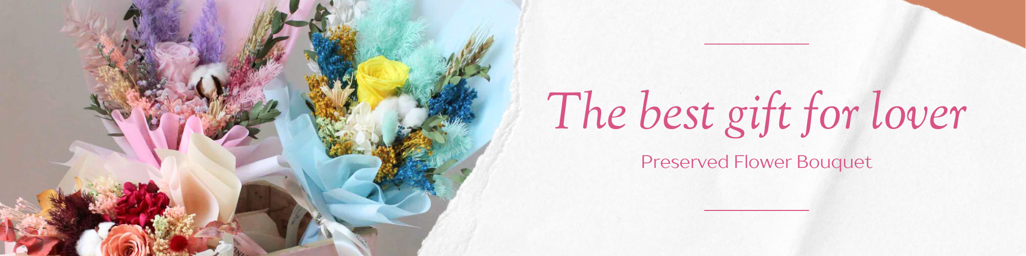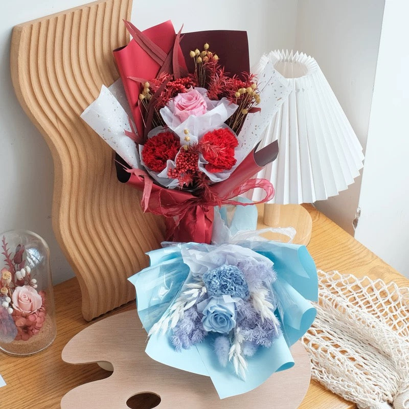 Our Preserved Flower Bouquet is a beautiful arrangement of long-lasting blooms, carefully preserved to maintain their vibrant color and elegance. Presented in a paper package with a handle which makes for a perfect gift that will stay fresh and beautiful for years. Ideal for any occasion.